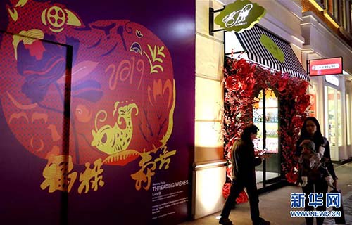 行人從香港街頭的吉祥“豬”畫(huà)旁走過(guò)(1月23日攝)。 農(nóng)歷豬年臨近,香港街頭裝扮得流光溢彩,喜氣盈盈。 新華社記者 吳曉初 攝