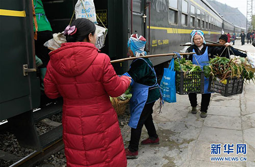 1月27日,乘客挑著擔(dān)子登上5639次列車(chē)。 由貴州玉屏開(kāi)往貴陽(yáng)的5639次列車(chē)是輛綠皮“慢火車(chē)”。沿途群眾每天挑著籮筐上車(chē),將自家出產(chǎn)的農(nóng)作物帶到貴陽(yáng)、凱里等地販賣(mài),再坐著火車(chē)把生產(chǎn)資料和日用品帶回家。時(shí)間一長(zhǎng),不少乘客直接在列車(chē)上買(mǎi)賣(mài)貨物。春節(jié)將至,蔬菜水果等農(nóng)產(chǎn)品交易較往日更加紅火,列車(chē)上的“年貨市場(chǎng)”洋溢著濃濃年味。 新華社發(fā)(許毅 攝)