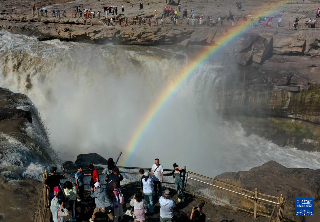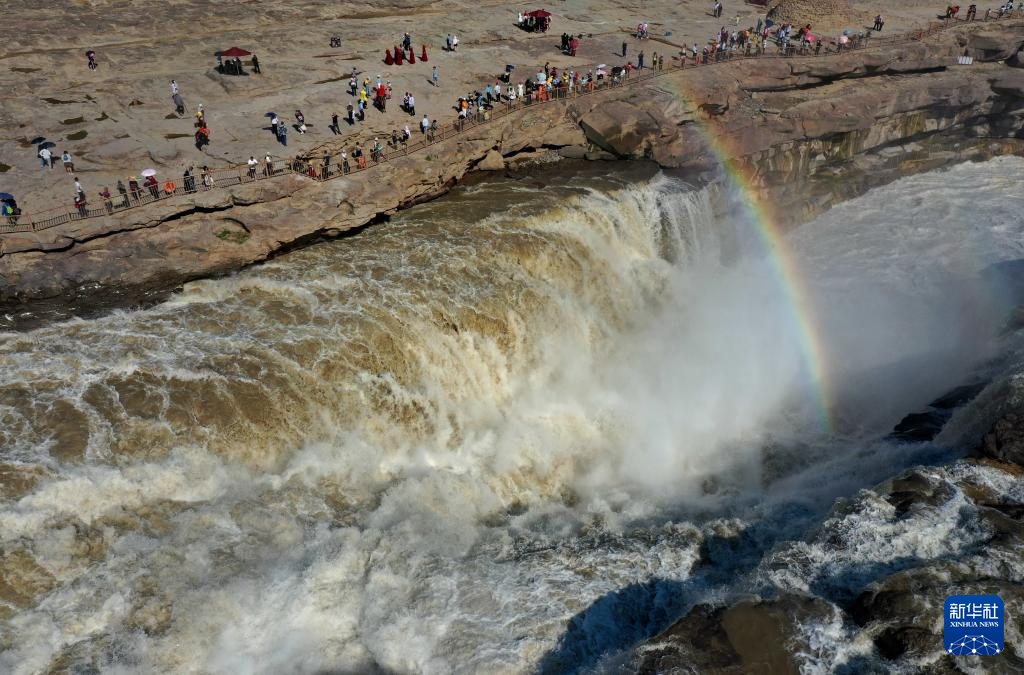 5月27日,游客在黃河壺口瀑布景區(qū)游覽(無(wú)人機(jī)照片)。 當(dāng)日,受降雨影響,黃河壺口瀑布水量增大,河水翻滾而下,飛濺起的水霧在陽(yáng)光的照射下,形成“彩橋通天”景觀。 新華社發(fā)(呂桂明 攝)
