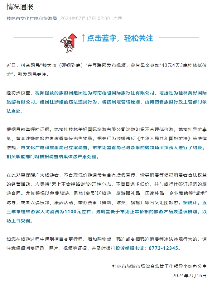 經(jīng)初步核查,視頻提及的旅游團組團社為海南佰駿國際旅行社有限公司,地接社為桂林美好國際旅游有限公司。組團社涉嫌的違法違規(guī)行為,將按屬地管轄原則,由海南省旅游行政主管部門依法查處。