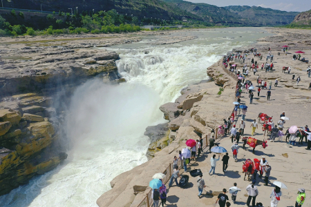 6月28日,游客在吉縣黃河壺口瀑布景區(qū)游覽觀瀑。仲夏時(shí)節(jié),隨著上游降雨增多,位于晉陜兩省交界的黃河壺口瀑布水量明顯增大,滾滾而來的黃河水如萬馬奔騰,氣勢磅礴,吸引來眾多游客。