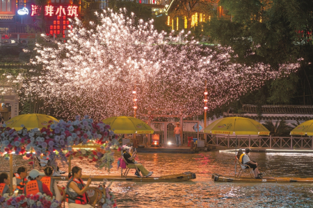 7月9日,游客乘坐“龍游貢水”竹筏在貢水河上觀賞打鐵花表演。位于湖北省恩施土家族苗族自治州的宣恩縣城是一座“景城一體·主客共享”的國(guó)家4A級(jí)景區(qū)。近年來,當(dāng)?shù)夭粩嗤脐惓鲂碌摹褒堄呜曀敝穹?、烏篷船等體驗(yàn)和觀賞項(xiàng)目,讓游客在璀璨燈火中沉浸式感受山區(qū)小城的夜色魅力。