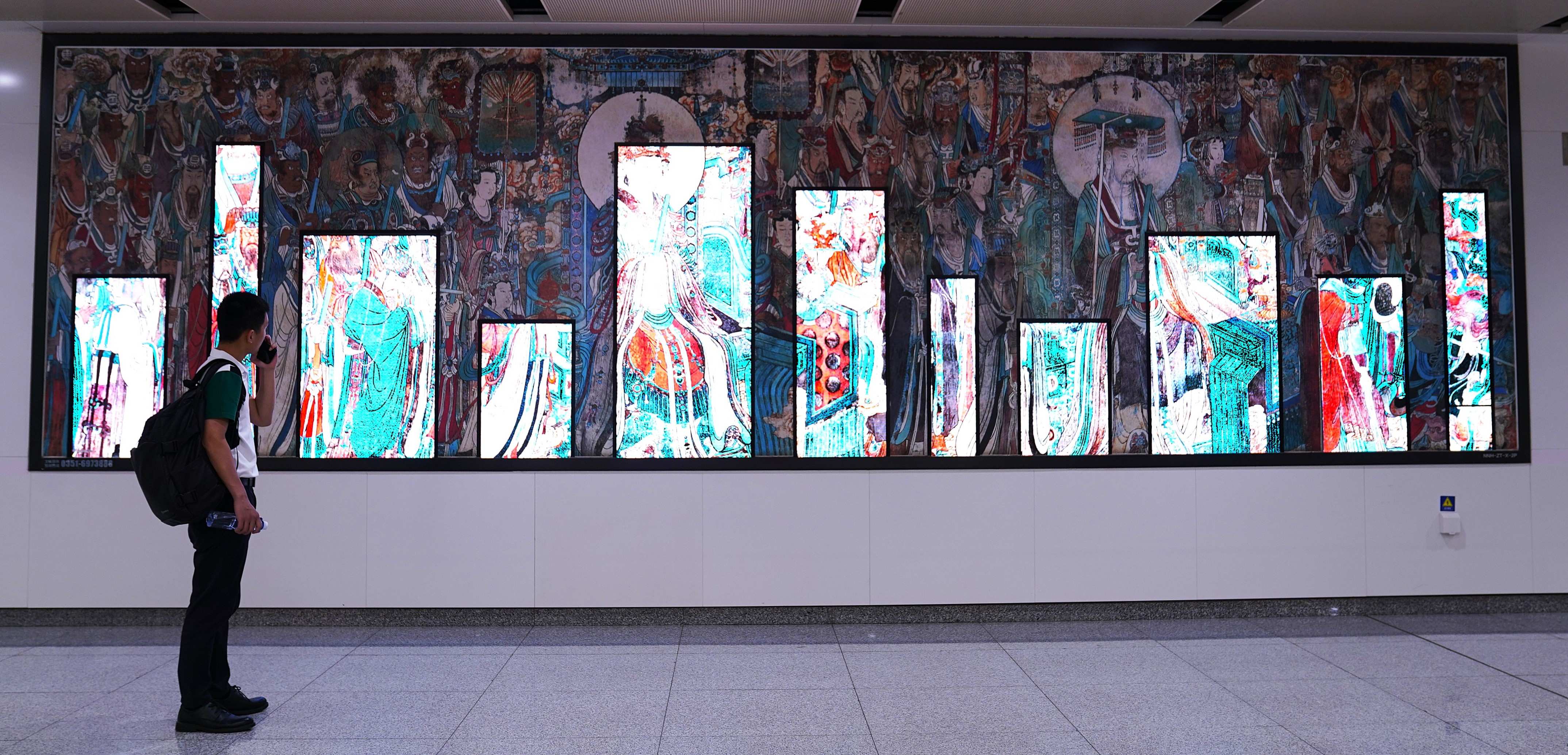 連永樂(lè)宮壁畫(huà)的絢麗、云岡石窟大佛的莊嚴(yán)、應(yīng)縣木塔的精巧,都被藝術(shù)復(fù)刻在站廳里——等車(chē)的間隙,有人會(huì)盯著壁畫(huà)上的飛天出神,有人會(huì)摸著梁思成筆下的古塔紋路發(fā)呆,匆忙的通勤路,忽然就多了份文化的滋養(yǎng)。