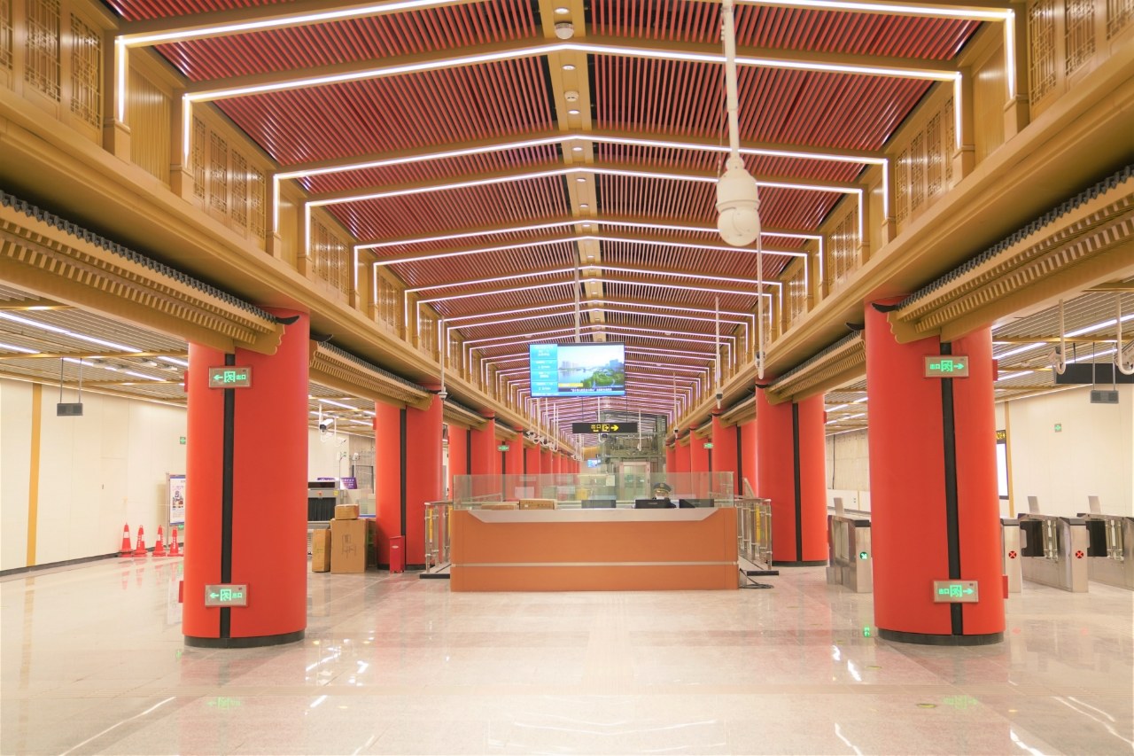 長(zhǎng)風(fēng)街站則以《西廂記》為靈感,提取中式園林月亮門(mén)元素,既展現(xiàn)出劇里的浪漫,又裹著中式園林的柔,營(yíng)造出“比翼雙飛”的浪漫氛圍。