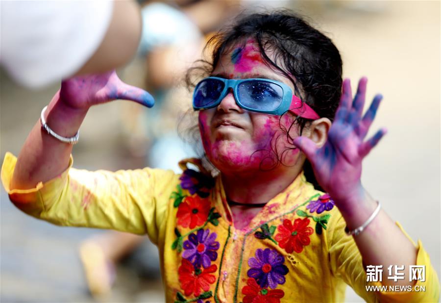 胡里節(jié)也叫“灑紅節(jié)”,人們?cè)谧约耗樕虾蜕砩贤可项伭希€向別人拋撒五顏六色的顏料和粉末,迎接春天的到來(lái)。新華社發(fā)(吳昂 攝)