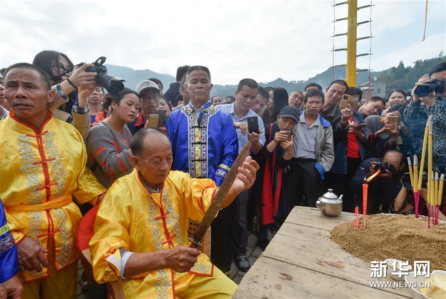 農(nóng)歷十月十五前后,福建西部武平縣各山村陸續(xù)進(jìn)入農(nóng)閑時(shí)節(jié)。按照當(dāng)?shù)仫L(fēng)俗,不同村子各自擇日舉辦民間活動(dòng),其中較有代表性的就是“上刀山”絕技。“上刀山”絕技在閩西山村流傳已有數(shù)百年歷史,表演者需光腳順著磨得鋒利閃亮的36把鋼刀,攀登至8米高的杉木柱子頂部,接受長(zhǎng)者祝福,祈求風(fēng)調(diào)雨順、五谷豐登。新華社記者 宋為偉 攝