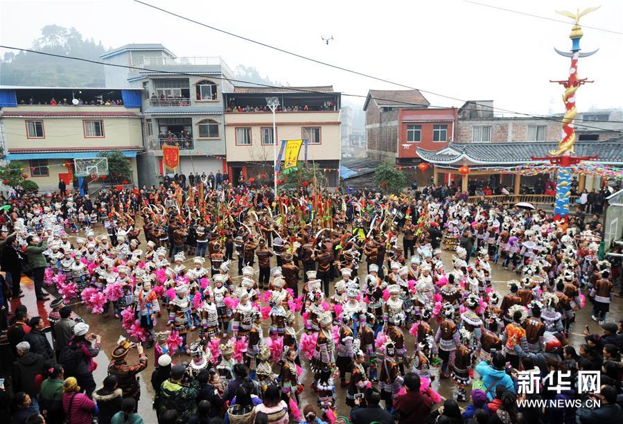 2月7日,廣西融水苗族自治縣安太鄉(xiāng)苗族群眾開展傳統(tǒng)的“打同年”民俗活動。當?shù)財?shù)百名苗族同胞與游客們歡聚一堂,一起開展對歌、蘆笙踩堂、文藝晚會等活動,歡慶新春佳節(jié)。 “打同年”是融水苗族村寨的一種民俗,即友好村寨之間的拜年聯(lián)歡活動。新華社記者 李斌 攝