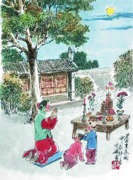 “中秋月。月到中秋偏皎潔?!辟p月是中秋節(jié)的重要習(xí)俗,我國(guó)民間的中秋賞月活動(dòng)約始于魏晉時(shí)期,盛于唐朝,當(dāng)時(shí)許多名篇佳作中都有詠月的詩(shī)句。北宋時(shí)期,以賞月活動(dòng)為中心的中秋節(jié)已成為普遍的民俗節(jié)日,然而與唐代不同的是,宋代關(guān)于賞月的作品多是感物傷懷,以陰晴圓缺喻人情世態(tài)。宋代的中秋夜是不眠之夜,夜市通宵營(yíng)業(yè),游人絡(luò)繹不絕,《東京夢(mèng)華錄》中載:“中秋節(jié)前,諸店皆賣(mài)新酒,貴家結(jié)飾臺(tái)榭,民家爭(zhēng)占酒樓玩月,笙歌遠(yuǎn)聞千里,嬉戲連坐至?xí)浴!币恍┑胤缴踔亮鱾鳌爸星镆乖酵硭介L(zhǎng)壽”的說(shuō)法,于是有了守夜的習(xí)俗。守夜時(shí),家里長(zhǎng)輩通常會(huì)給小孩講關(guān)于月亮的故事,如嫦娥奔月、吳剛伐桂等,孩子們個(gè)個(gè)聽(tīng)得津津有味。