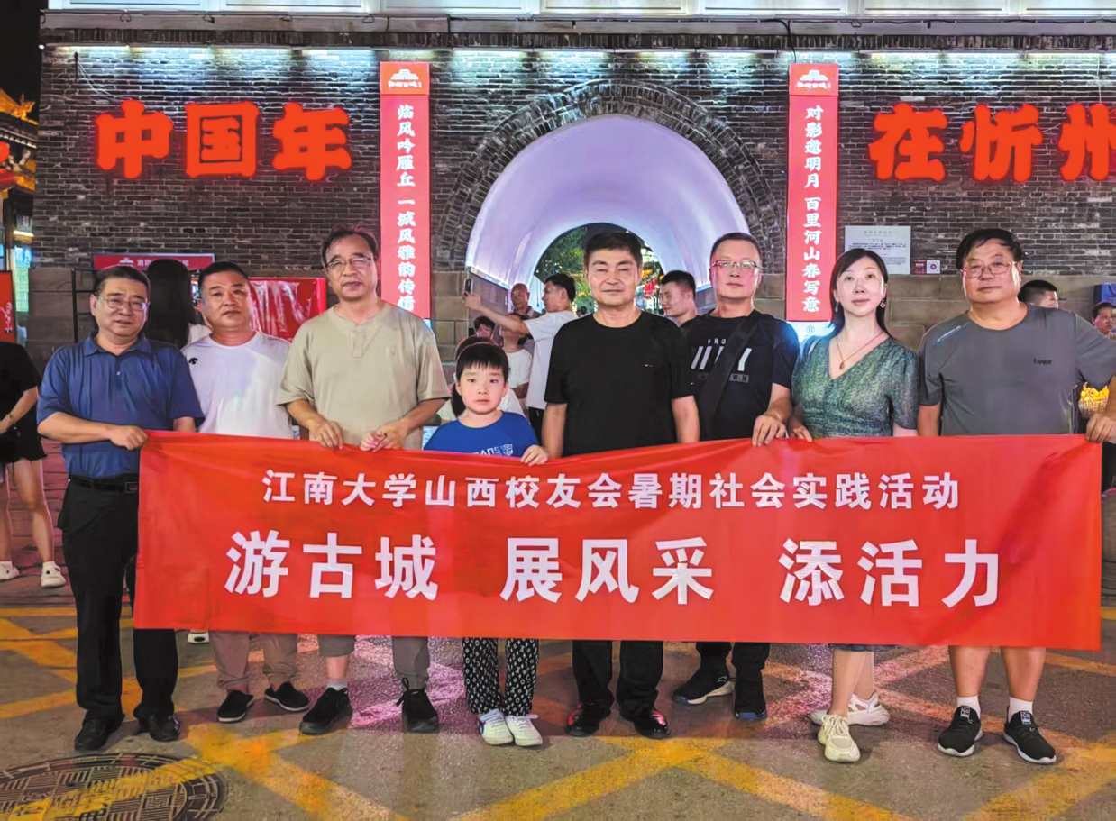 夏日的傍晚,落日熔金,忻州古城城樓如剪影般佇立,與暮色深沉交融。校友們沿著石板路緩緩前行,沿街仿古建筑的恢宏氣勢深深地吸引著大家。夜幕下的古樓在彩燈的映照下更顯雄偉,校友們撐起“游古城展風采添活力”的紅色會標合影留念,鏡頭記錄下了我們相聚的寶貴瞬間。