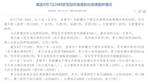 人民網(wǎng)北京9月8日電(董童)國家衛(wèi)生健康委于今日在官網(wǎng)發(fā)布的《截至9月7日24時(shí)新型冠狀病毒肺炎疫情最新情況》(以下簡(jiǎn)稱“情況)”提出,9月7日0—24時(shí),31個(gè)?。ㄗ灾螀^(qū)、直轄市)和新疆生產(chǎn)建設(shè)兵團(tuán)報(bào)告新增確診病例10例,均為境外輸入病例(四川5例,廣東2例,天津1例,福建1例,陜西1例);無新增死亡病例;無新增疑似病例。當(dāng)日新增治愈出院病例15例,解除醫(yī)學(xué)觀察的密切接觸者336人,重癥病例與前一日持平。