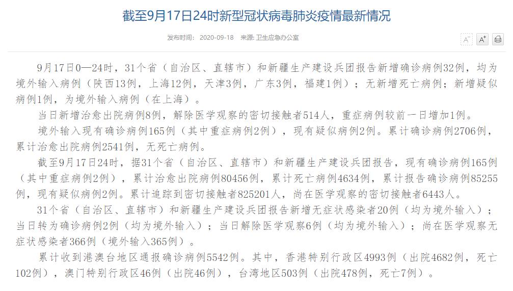 人民網(wǎng)北京9月18日電(董童)國家衛(wèi)生健康委于今日在官網(wǎng)發(fā)布的《截至9月17日24時新型冠狀病毒肺炎疫情最新情況》(以下簡稱“情況”)提出,9月17日0—24時,31個?。ㄗ灾螀^(qū)、直轄市)和新疆生產(chǎn)建設(shè)兵團報告新增確診病例32例,均為境外輸入病例(陜西13例,上海12例,天津3例,廣東3例,福建1例);無新增死亡病例;新增疑似病例1例,為境外輸入病例(在上海)。當(dāng)日新增治愈出院病例8例,解除醫(yī)學(xué)觀察的密切接觸者514人,重癥病例較前一日增加1例。