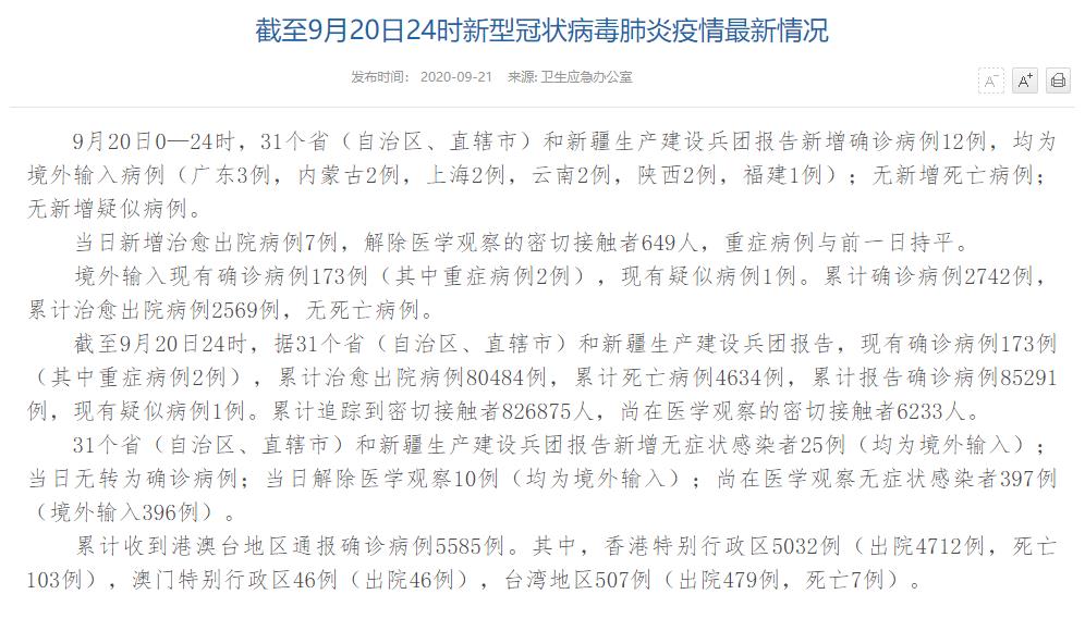 人民網(wǎng)北京9月21日電(董童)國(guó)家衛(wèi)生健康委于今日在官網(wǎng)發(fā)布的《截至9月20日24時(shí)新型冠狀病毒肺炎疫情最新情況》(以下簡(jiǎn)稱“情況”)提出,9月20日0—24時(shí),31個(gè)省(自治區(qū)、直轄市)和新疆生產(chǎn)建設(shè)兵團(tuán)報(bào)告新增確診病例12例,均為境外輸入病例(廣東3例,內(nèi)蒙古2例,上海2例,云南2例,陜西2例,福建1例);無新增死亡病例;無新增疑似病例。當(dāng)日新增治愈出院病例7例,解除醫(yī)學(xué)觀察的密切接觸者649人,重癥病例與前一日持平。