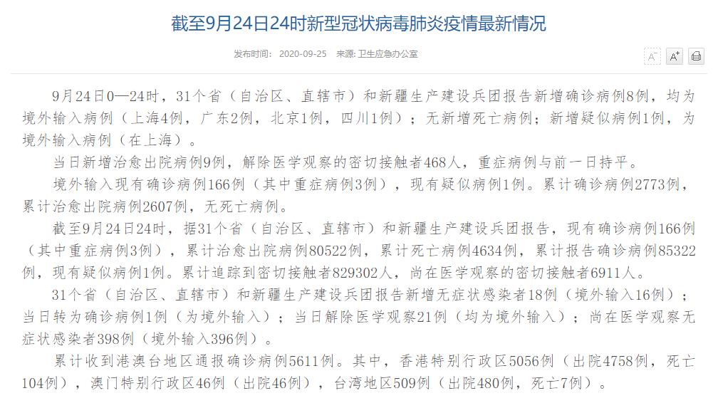 人民網(wǎng)北京9月25日電(董童)國(guó)家衛(wèi)生健康委于今日在官網(wǎng)發(fā)布的《截至9月24日24時(shí)新型冠狀病毒肺炎疫情最新情況》(以下簡(jiǎn)稱“情況”)顯示,9月24日0—24時(shí),31個(gè)省(自治區(qū)、直轄市)和新疆生產(chǎn)建設(shè)兵團(tuán)報(bào)告新增確診病例8例,均為境外輸入病例(上海4例,廣東2例,北京1例,四川1例);無(wú)新增死亡病例;新增疑似病例1例,為境外輸入病例(在上海)。當(dāng)日新增治愈出院病例9例,解除醫(yī)學(xué)觀察的密切接觸者468人,重癥病例與前一日持平。