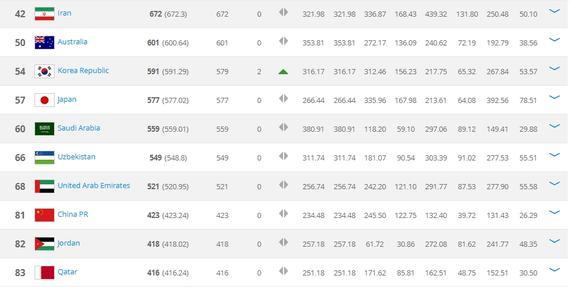 由于4月份沒有國家隊賽事,因此,大多數(shù)國家隊的積分都沒有上漲,亞洲前10位球隊的世界排名大多沒有變化,只有韓國隊小幅上升了兩個位次,從第56升至第54。而中國隊跟上一期排名完全一樣,依然排世界第81位,在亞洲依然排名第8。