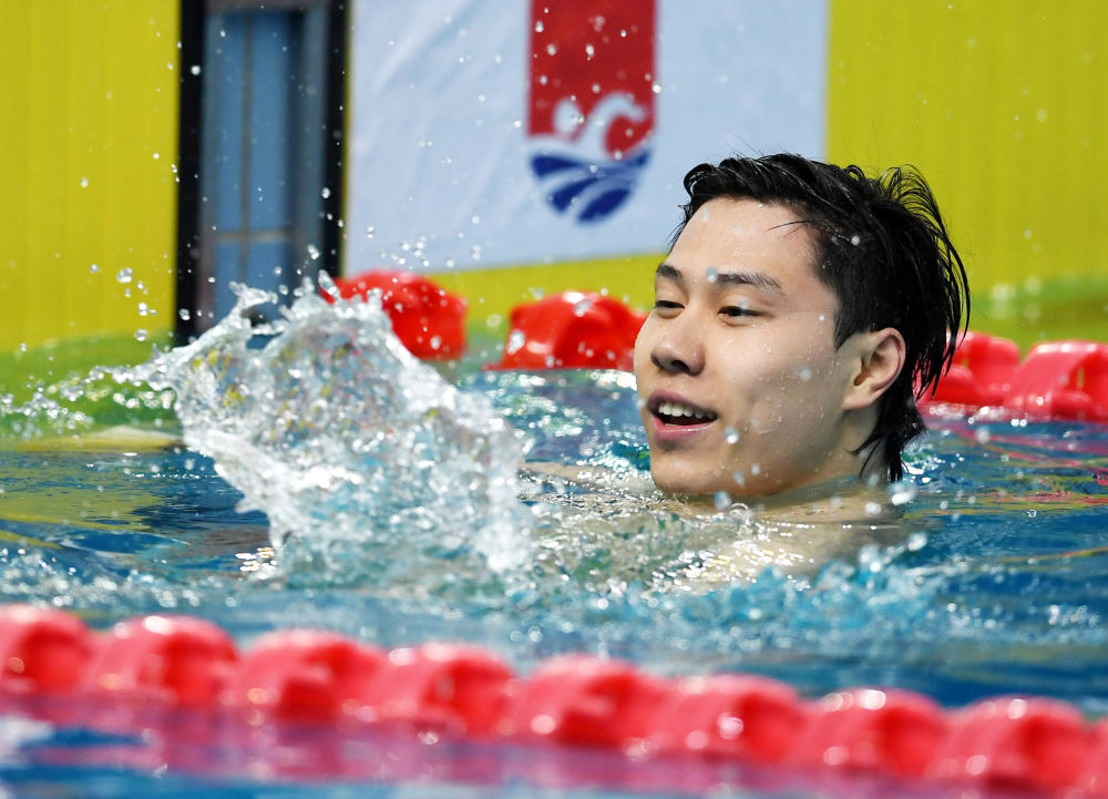 3月20日,覃海洋在男子100米蛙泳決賽后。新華社記者 李紫恒 攝