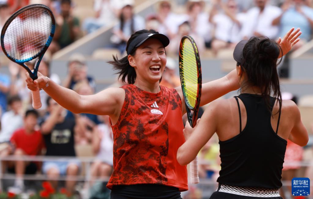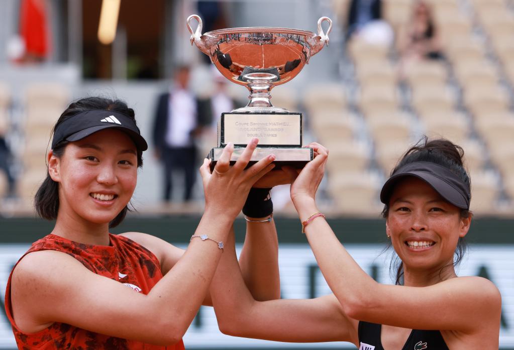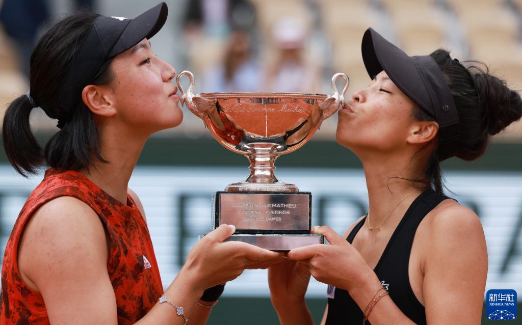 6月11日,王欣瑜(左)/謝淑薇捧起女雙冠軍獎杯。新華社記者 高靜 攝 新華社巴黎6月11日電(記者肖亞卓、陳毓珊)中國選手再次在網(wǎng)球大滿貫賽事中登頂!在11日進(jìn)行的2023年法國網(wǎng)球公開賽女雙決賽中,中國隊“小花”王欣瑜搭檔中國臺北名將謝淑薇在先失一盤的情況下以1:6、7:6(5)、6:1逆轉(zhuǎn)戰(zhàn)勝加拿大選手費爾南德斯和美國選手湯森的組合,奪取冠軍。 這僅是王欣瑜和謝淑薇搭檔以來參加的第二站賽事。倆人是在一個月前的意大利公開賽時遇到并臨時決定配對雙打。法網(wǎng)前一周的斯特拉斯堡公開賽是她倆搭檔的首秀,當(dāng)時止步第二輪。來到羅蘭·加洛斯,這對“海峽組合”一路過關(guān)斬將,連續(xù)淘汰5對種子選手,最終問鼎冠軍。