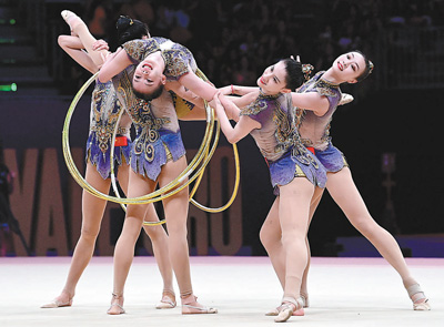 中國藝術體操隊的良好狀態(tài)延續(xù)到最后一個比賽日。在5圈單項決賽中,率先登場的中國隊高質量地完成整套動作,以36.550分獲得金牌,為中國藝術體操隊贏得首個世界冠軍。在隨后進行的3帶2球單項決賽中,中國隊依舊發(fā)揮亮眼,以32.800分收獲一枚銀牌。