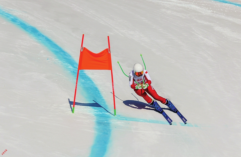張玉營在高山滑雪女子滑降比賽中。