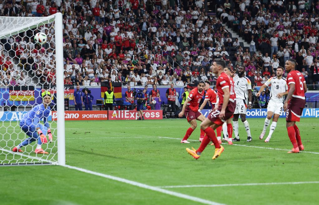 6月23日,德國隊(duì)球員菲爾克魯格(右二)破門得分。當(dāng)日,在德國法蘭克福進(jìn)行的2024歐洲足球錦標(biāo)賽A組第三輪比賽中,德國隊(duì)1比1戰(zhàn)平瑞士隊(duì)。新華社記者 白雪飛 攝