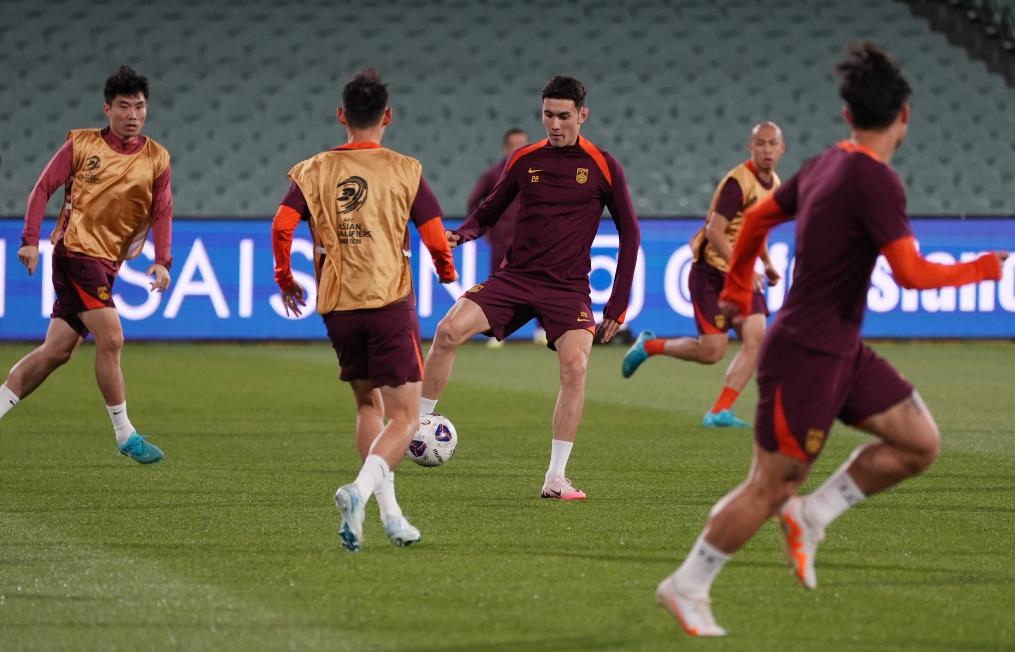 10月9日,中國隊球員拜合拉木(中)在訓(xùn)練中。新華社發(fā)(謝思達 攝)