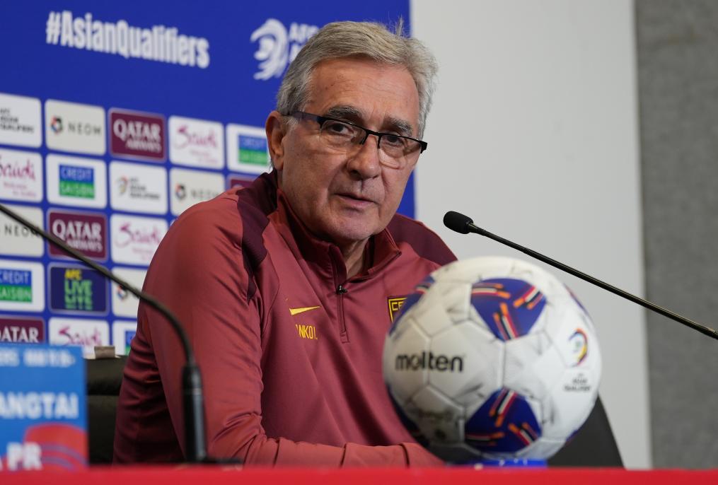 10月9日,中國隊主教練伊萬科維奇在發(fā)布會上。新華社發(fā)(謝思達 攝)