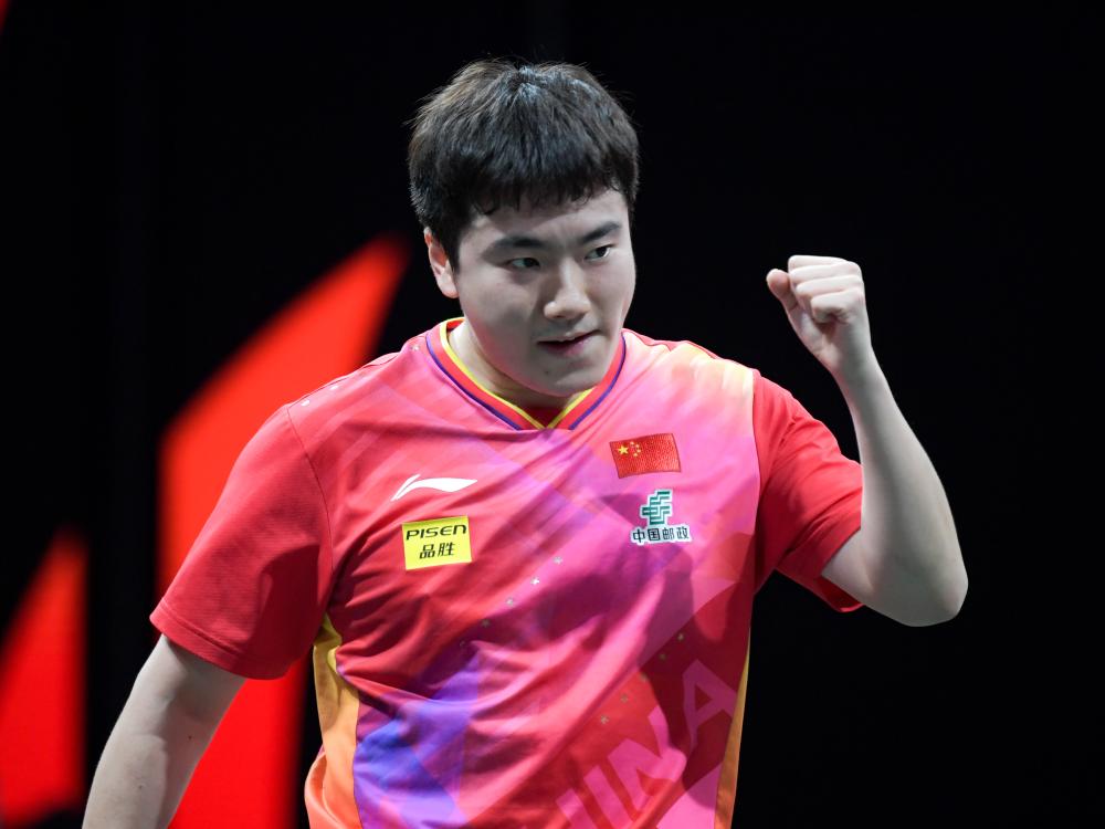 12月4日,中國(guó)隊(duì)選手梁靖崑在男單比賽中慶祝得分。新華社記者 王曦 攝