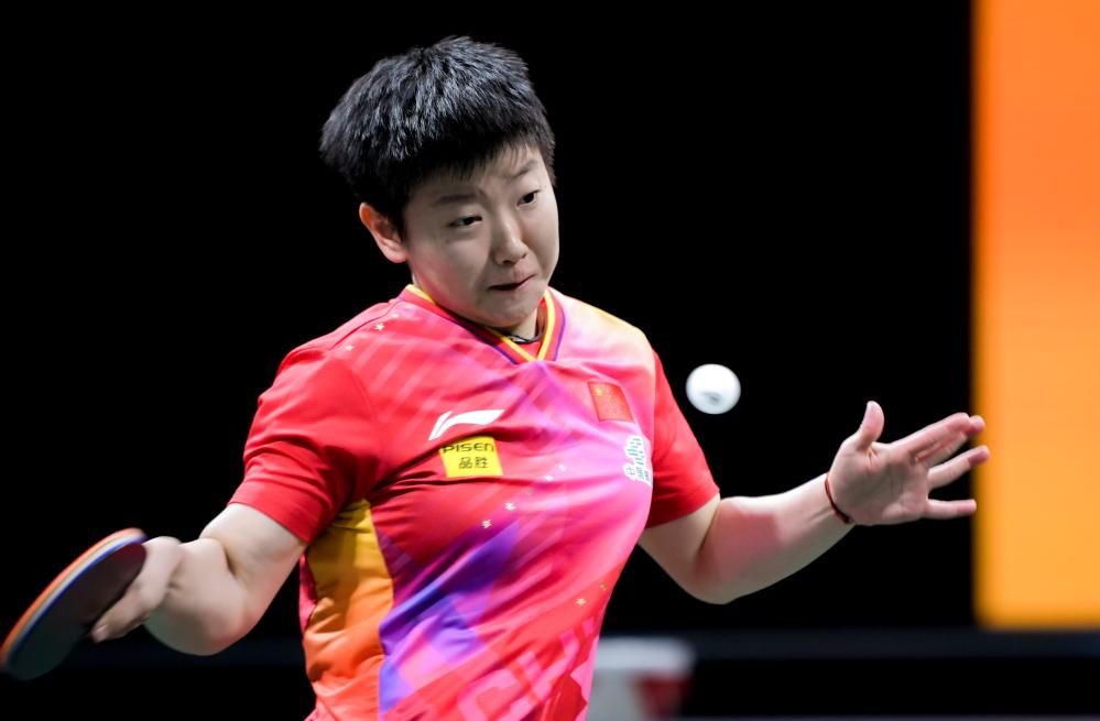 12月4日,中國(guó)隊(duì)選手孫穎莎在女單比賽中回球。新華社記者 王曦 攝