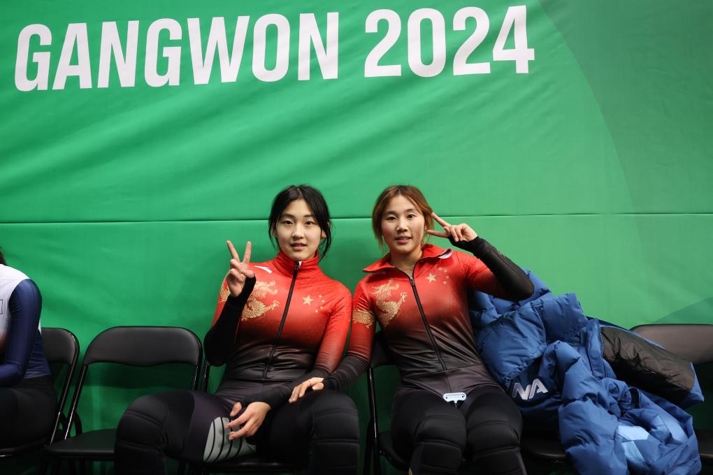 1月20日,中國選手楊婧茹(右)與李金恣在比賽后慶祝。當(dāng)日,在韓國江陵進(jìn)行的2024年江原道冬青奧會短道速滑女子1500米決賽中,中國運(yùn)動員楊婧茹和李金恣分獲金、銀牌。新華社記者 許雅楠 攝