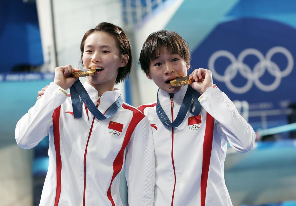 7月31日,冠軍中國選手陳芋汐(左)/全紅嬋在頒獎儀式上。當(dāng)日,在巴黎奧運(yùn)會跳水女子雙人十米臺決賽中,陳芋汐/全紅嬋奪得金牌。新華社記者 張玉薇 攝