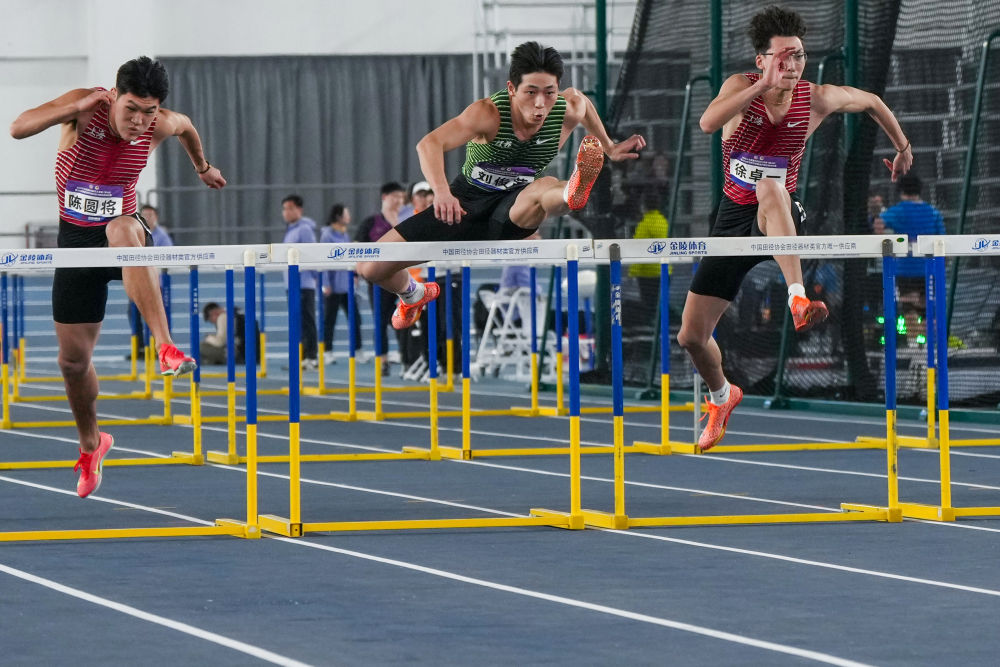 2月23日,江蘇隊(duì)選手劉俊茜(中)在男子60米欄決賽中獲得冠軍。新華社記者 李博 攝
