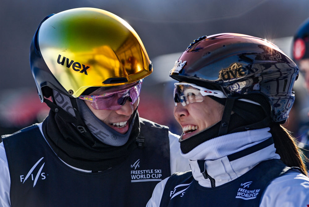 2月24日,中國隊(duì)李天馬(左)與徐夢桃在比賽后慶祝。新華社記者 顏麟蘊(yùn) 攝