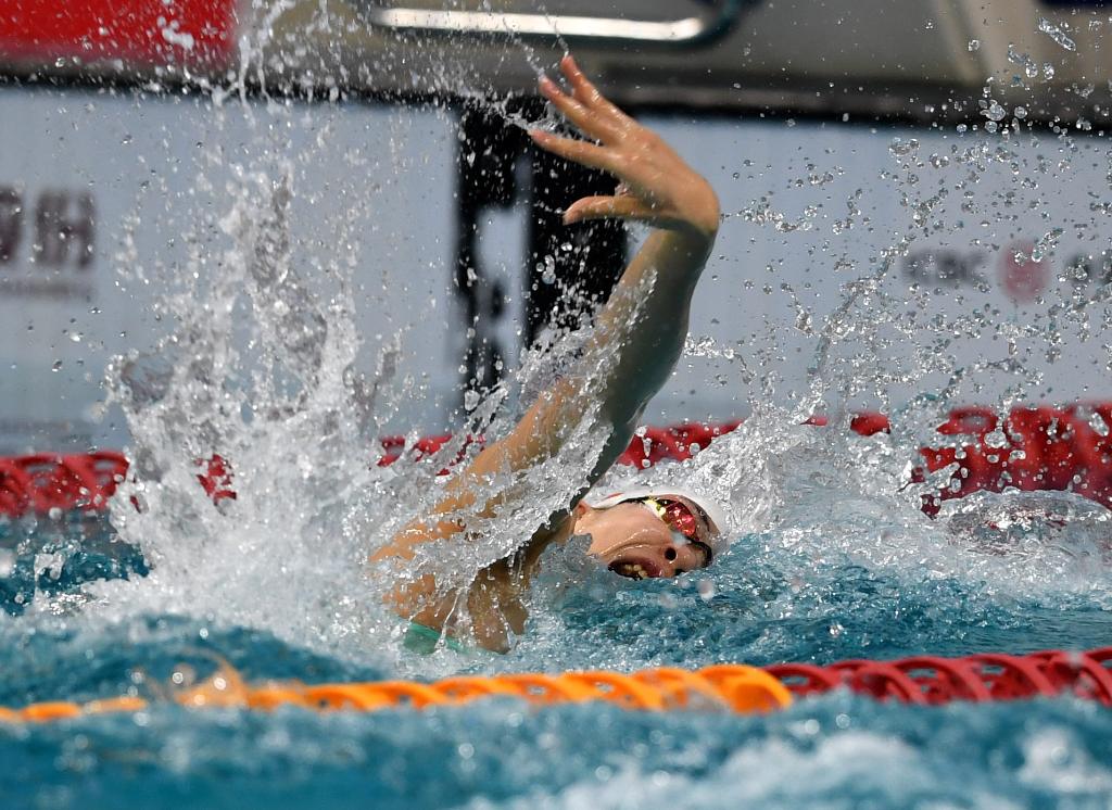 3月18日,江西隊選手程玉潔在女子100米自由泳決賽中,最終她以53秒91的成績獲得冠軍。新華社記者 李紫恒 攝