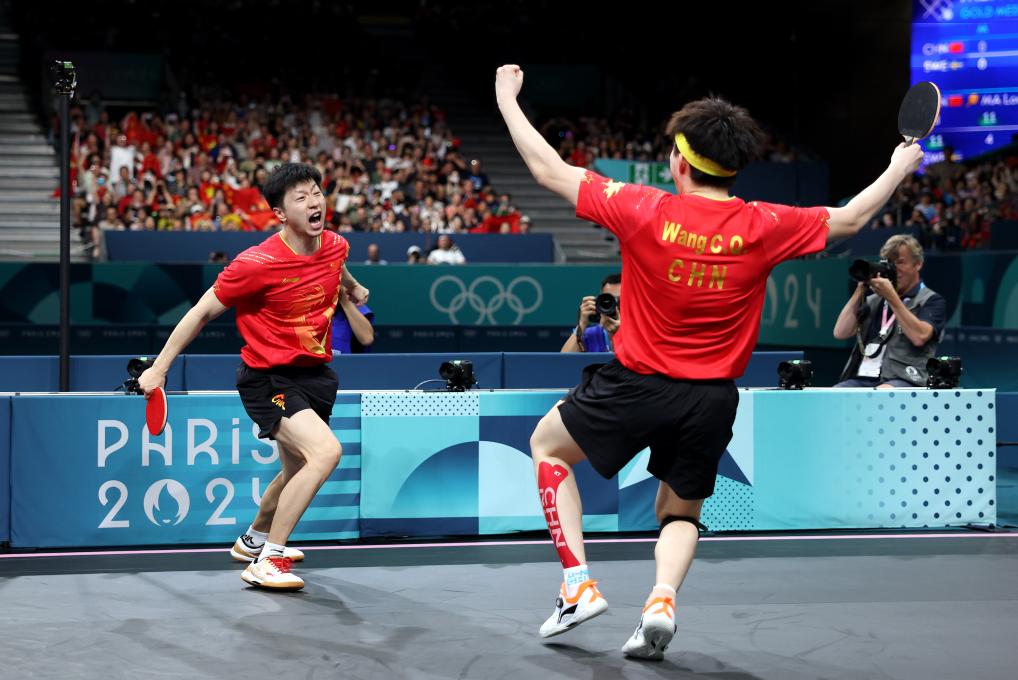 2024年8月9日,中國(guó)隊(duì)組合馬龍(左)/王楚欽慶祝勝利。當(dāng)日,在巴黎奧運(yùn)會(huì)乒乓球男團(tuán)金牌賽中,中國(guó)隊(duì)?wèi)?zhàn)勝瑞典隊(duì),獲得冠軍。新華社記者 劉續(xù) 攝