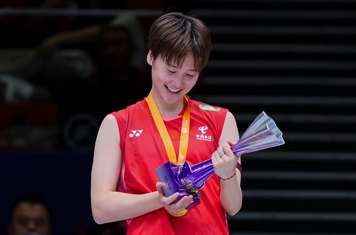 4月13日,陳雨菲在頒獎儀式上手捧獎杯。新華社記者 孫非 攝