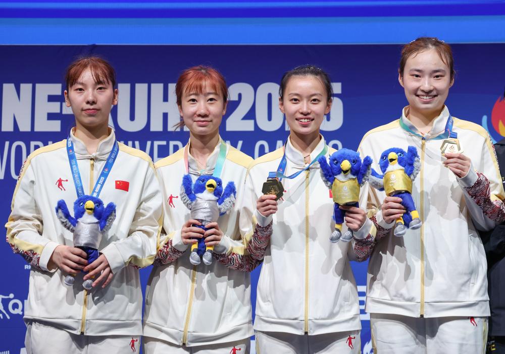 7月23日,冠軍中國隊(duì)選手穆文喆(中)、邢佳妮(左)和郭清在頒獎(jiǎng)儀式上。新華社記者 李穎 攝