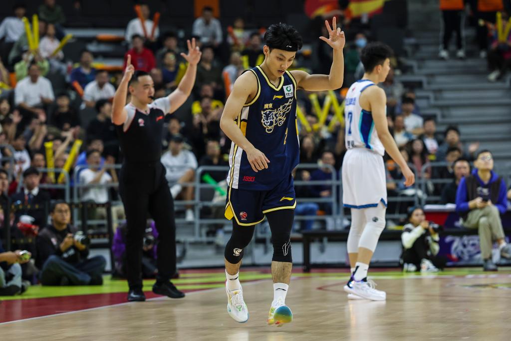 廣東隊球員徐杰(中)在比賽中投進三分球后慶祝。新華社發(fā)(鄭家雄攝)