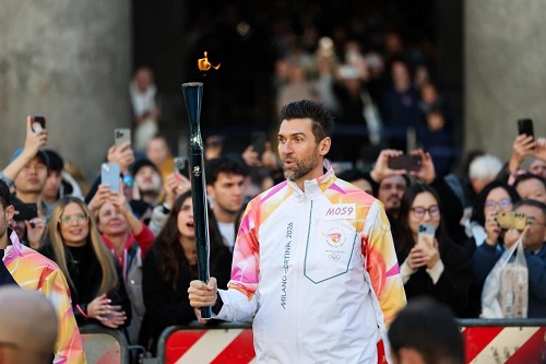 2025年12月6日,在意大利羅馬萬神殿,火炬手、意大利籃球運動員安德烈亞·巴爾尼亞尼在傳遞火炬。當日,2026年米蘭-科爾蒂納冬奧會火炬在意大利羅馬傳遞。新華社記者李京攝