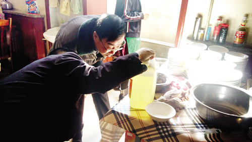 執(zhí)法人員在黑作坊取不合格洗潔精樣品