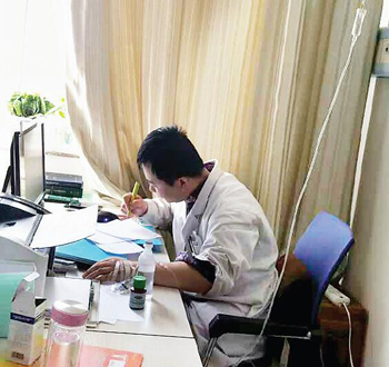 3月10日起,在微信朋友圈里,這張醫(yī)生掛吊瓶接診的照片引起了很多人的關(guān)注。照片中一名身穿白大褂的醫(yī)生正在值班室埋頭寫病歷,他的一只手上正輸著液體。筆者了解到,是一名病人的家屬上傳了這張照片。他的父親十幾天前曾在中醫(yī)院9樓心血管病房住院,在父親住院的一天,他去值班室詢問父親病情時,看到了徐強醫(yī)生打吊瓶堅持工作,這讓他十分感動,于是就悄悄用手機拍了照并上傳至微信朋友圈。