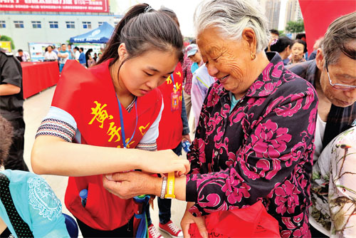 參與活動的愛心志愿者通過豐富多彩的文藝節(jié)目,宣傳黃手環(huán)的正確使用方法,還向廣大市民講解有關(guān)老年人的護(hù)理知識和一些急救常識,相關(guān)醫(yī)療機(jī)構(gòu)派出專業(yè)人員在現(xiàn)場開展了義診活動,市老齡辦對本次慈善公益活動給予了大力支持。圖為志愿者在為一位老人戴上黃手環(huán)。(魯明強 攝影報道)