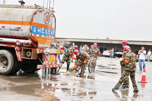 第三家上場(chǎng)的是安通危貨運(yùn)輸有限公司,他們演練的科目是液堿泄露處置。假定裝載液堿的危貨車行駛中發(fā)生泄露后,駕駛員和押運(yùn)員現(xiàn)場(chǎng)采取緊急措施,并請(qǐng)求公司火速救援。公司應(yīng)急救援組立即啟動(dòng)應(yīng)急預(yù)案,并向火警119、保險(xiǎn)公司報(bào)案。環(huán)境監(jiān)測(cè)組、現(xiàn)場(chǎng)救援組、事故現(xiàn)場(chǎng)警戒和人員疏散組、事故調(diào)查組立即到達(dá)現(xiàn)場(chǎng)分頭展開(kāi)工作,泄漏液堿最終處置完畢,避免了二次事故和次生災(zāi)害的發(fā)生,未造成環(huán)境污染。