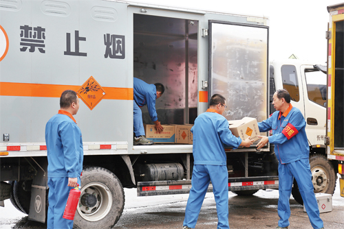 最后上場(chǎng)的是同力運(yùn)輸有限公司,他們演練的科目是民爆用品交通事故應(yīng)急救援。模擬一輛裝載有20箱炸藥的廂式專用貨車被追尾,駕駛員查看現(xiàn)場(chǎng)拍照、報(bào)警,請(qǐng)求救援,押運(yùn)員立即保護(hù)現(xiàn)場(chǎng)避免發(fā)生二次事故。公司第一時(shí)間組織救援人員和車輛到達(dá)事發(fā)地,將事故車上的炸藥輕拿輕放搬移到前來(lái)救援的一輛廂式貨車上。炸藥運(yùn)走后,險(xiǎn)情排除,事故現(xiàn)場(chǎng)等待交警處理,進(jìn)入交通事故處理程序。
