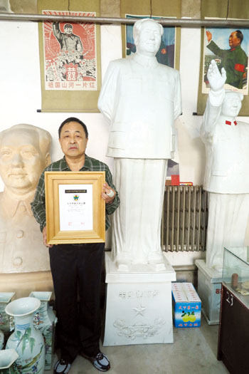 據(jù)了解,梁茂生從小熱愛收藏,在擔任“晉北民間收藏協(xié)會”會長后,用了六年時間從北京、天津、石家莊、太原等地,收購回價值200余萬元的文革時期藏品,有毛主席塑像、毛主席語錄、像章、毛主席像刺繡、報紙合訂本、全套樣板戲唱片;文革時期的景德鎮(zhèn)瓷雕、鐘表、印章;文革時期的宣傳資料、紅衛(wèi)兵上山下鄉(xiāng)的油畫等。這次獲得“大世界基尼斯之最”的毛主席瓷站像是其2萬件(套)收藏作品中的一件。