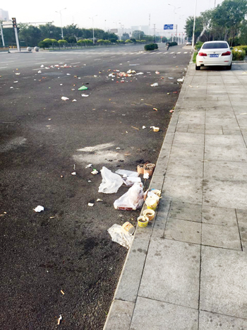 城區(qū)高鐵廣場(chǎng)前,慕山路與雁門大道丁字路口,每天晚上有小商販在此經(jīng)營,本無可厚非,但每天產(chǎn)生的垃圾,既影響市容環(huán)境,還給環(huán)衛(wèi)工人增加了工作量,呼吁市民及小商販愛護(hù)環(huán)境,也希望相關(guān)部門管理維護(hù)公共環(huán)境。一網(wǎng)友攝于8月22日 (責(zé)任編輯:籍俊霞) |