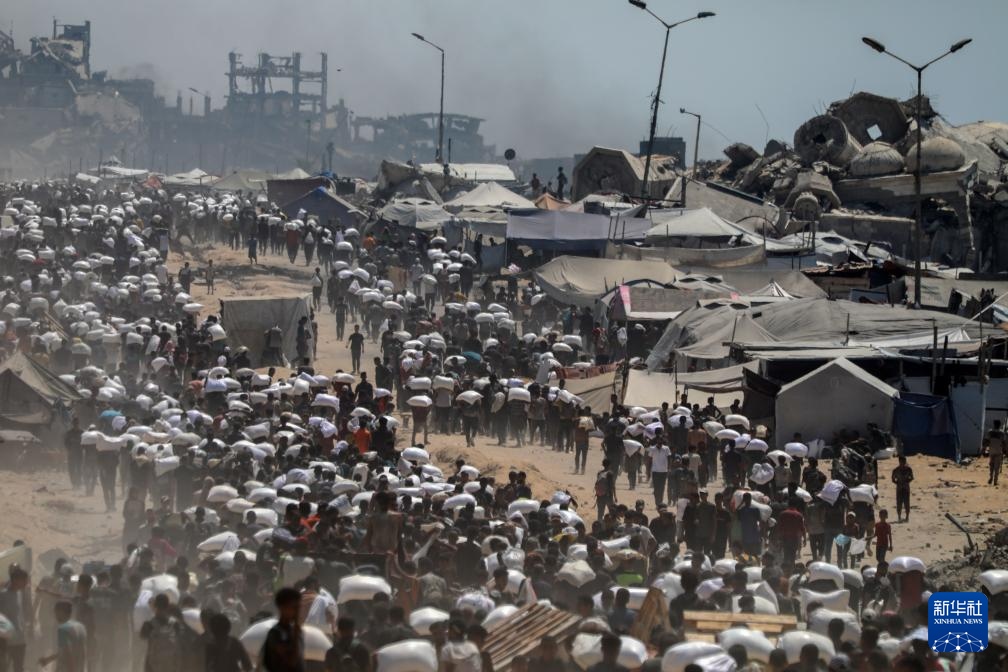 7月27日,在加沙地帶北部城鎮(zhèn)拜特拉希亞,人們領(lǐng)取通過邊境口岸進(jìn)入加沙的援助物資。新華社發(fā)(里澤克·阿卜杜勒賈瓦德攝)