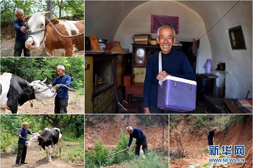 曹晉忠,男,1949年出生,山西省長治市武鄉(xiāng)縣鋪上村人。曹晉忠是村里的動物防疫員,自己種了4畝玉米、2畝小米。因為妻子常年臥病在床,曹晉忠一家是該村的精準扶貧對象。曹晉忠說,醫(yī)護人員經常上門進行健康狀況隨訪,駐村工作隊也常來家里幫忙,現(xiàn)在看病不發(fā)愁,干活有人幫,生活挺好的。 右上:曹晉忠肖像;左上、左中、左下:曹晉忠在給村里的牛做檢查;下中、下右:曹晉忠在地里干農活(拼版照片,6月12日攝)。 地處晉東南的山西省長治市,位于由太行山、太岳山環(huán)繞而成的上黨盆地中。在群山中、崖壁上,許多村莊自然條件惡劣,基礎設施落后,脫貧致富是大山深處人們的迫切心愿。 近年來,一場場脫貧攻堅戰(zhàn),在一個個深山村打響。政府全力探索脫貧路徑的同時,山區(qū)百姓因地制宜,靠自己的雙手和智慧走上致富路,交出了一份扎實的脫貧答卷。 記者在太行山、太岳山一路尋訪,記錄下多位70歲老人的生活。這些共和國的同齡人,親歷了山鄉(xiāng)的巨變,見證著長治山區(qū)脫貧攻堅偉大工程的一步步推進。 新華社記者 詹彥 攝