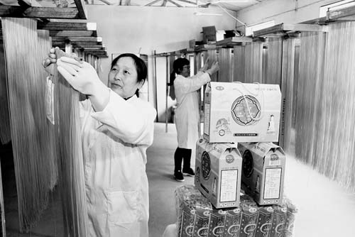 7月20日,工人正在晾曬生產(chǎn)出的“河撈面”。始制于北宋年間的五臺(tái)縣民間美食“河撈面”,如今又被該縣豆村鎮(zhèn)列為產(chǎn)業(yè)扶貧項(xiàng)目。在當(dāng)?shù)?,一個(gè)由興坪村“霞輝”玉米加工專業(yè)合作社生產(chǎn)出的玉米、高粱、蕎麥、大豆等12類盒裝與袋裝產(chǎn)品,已俏銷太原、忻州等食品市場(chǎng),年產(chǎn)值達(dá)56萬元。(金俊賢 攝)