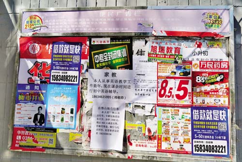 情況一:記者近日在忻州城區(qū)和平街一路口看到,一塊為市民提供告知服務(wù)的“便民公告欄”明確提示不允許張貼任何商業(yè)廣告,可是如今上面卻貼滿了商業(yè)廣告,而且張貼得極不整齊,這成為影響市容環(huán)境的一處死角,希望相關(guān)部門(mén)及時(shí)清理,也希望廣大市民按要求發(fā)布便民信息。