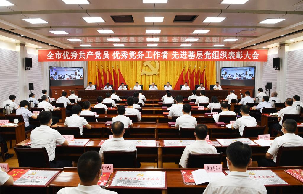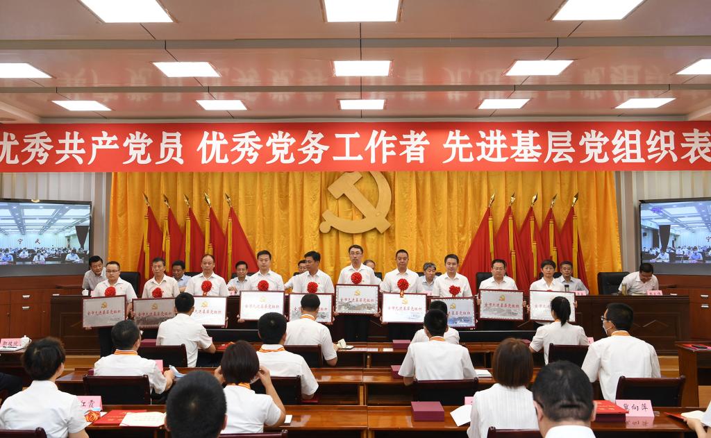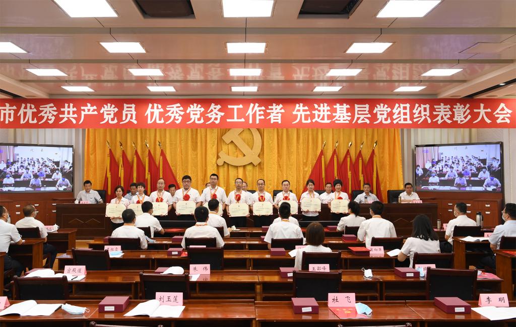 上午8時30分,大會正式開始,全體起立,奏唱國歌。來自全市各行各業(yè)、在工作中取得優(yōu)異成績的99名共產黨員、100名黨務工作者和100個基層黨組織,分別被授予“全市優(yōu)秀共產黨員”“全市優(yōu)秀黨務工作者”“全市先進基層黨組織”榮譽稱號。受到表彰的優(yōu)秀個人和先進集體代表先后上臺領獎,會場響起熱烈掌聲。