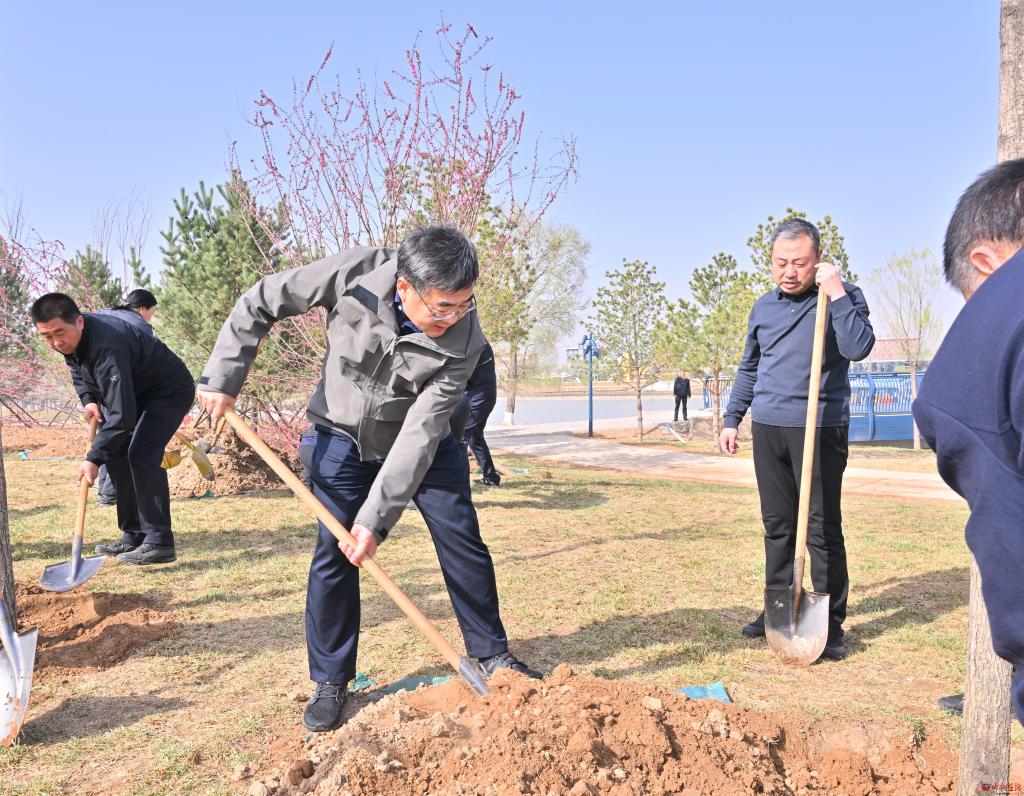 暮春時(shí)節(jié),草木吐綠、萬(wàn)物萌發(fā)。朱曉東等市領(lǐng)導(dǎo)一到植樹(shù)點(diǎn),就拿起鐵鍬等植樹(shù)工具,與大家一起扶正樹(shù)苗、揮鍬鏟土、培土圍堰、提桶澆水,現(xiàn)場(chǎng)一派干勁十足、熱火朝天的景象。朱曉東一邊植樹(shù),一邊詢問(wèn)苗木品種特點(diǎn)、日常養(yǎng)護(hù)等情況,叮囑有關(guān)部門人員要做好苗木管護(hù)工作,提高植樹(shù)成活率。在大家的共同努力下,新栽下的樟子樹(shù)、榆葉梅、油松、山杏等苗木迎風(fēng)招展、生機(jī)盎然。